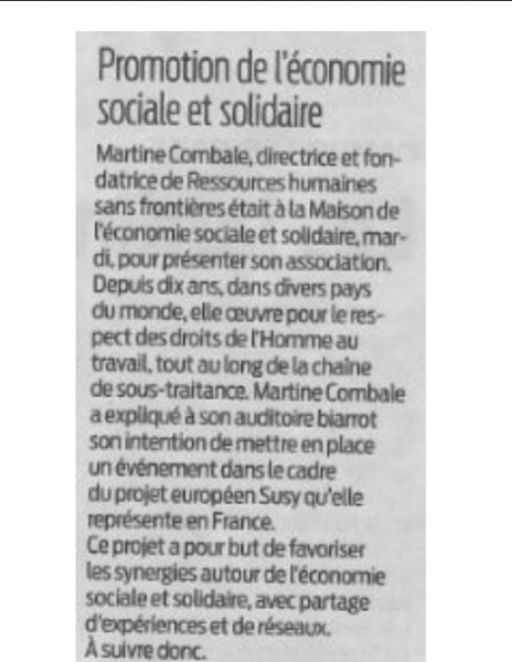 « Martine Combemale, directrice et fondatrice de Ressources Humanes Sans Frontières était à la Maison de l’Economie Sociale et Solidaire, mardi, pour présenter son association. Depuis 10 ans, dans divers pays du monde, elle œuvre pour le respect des droits de l’Homme au travail, tout au long de la chaîne de sous-traitance. Martine Combemale a expliqué à son auditoire biarrot son intention de mettre en place un événement dans le cadre du projet européen SUSY qu’elle représente en France. Ce projet a pour but de favoriser les synergies autour de l’économie sociale et solidaire, avec partage d’expériences et de réseaux. A suivre donc. »